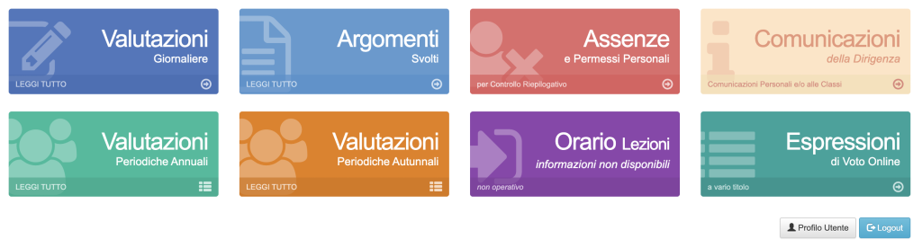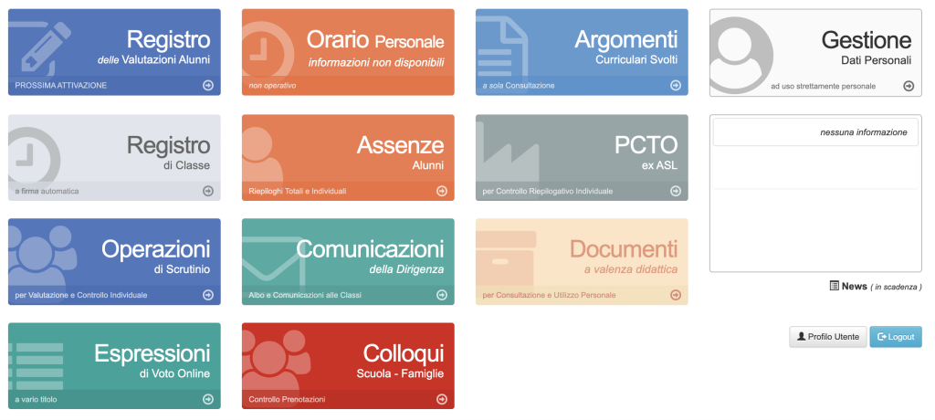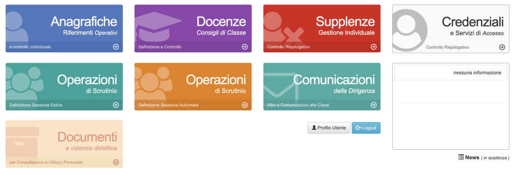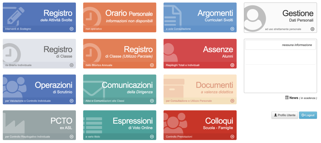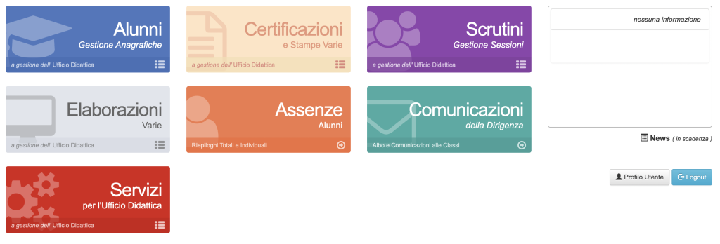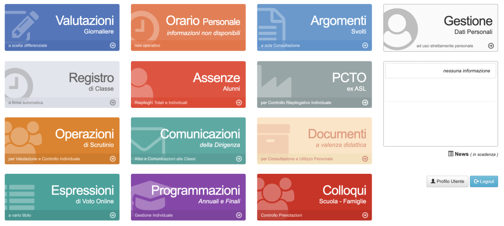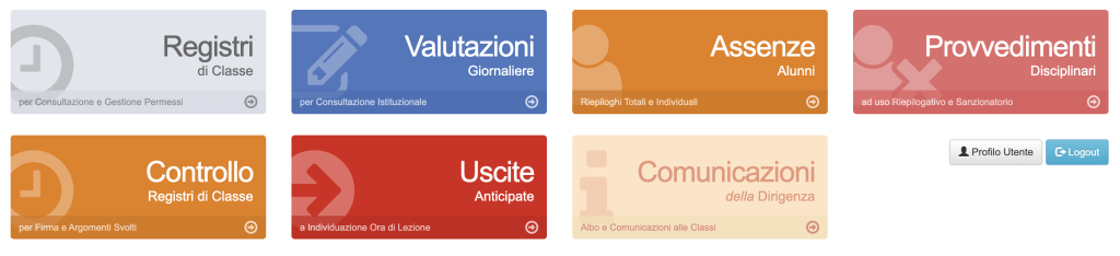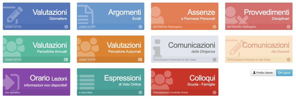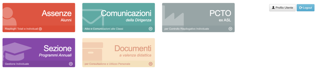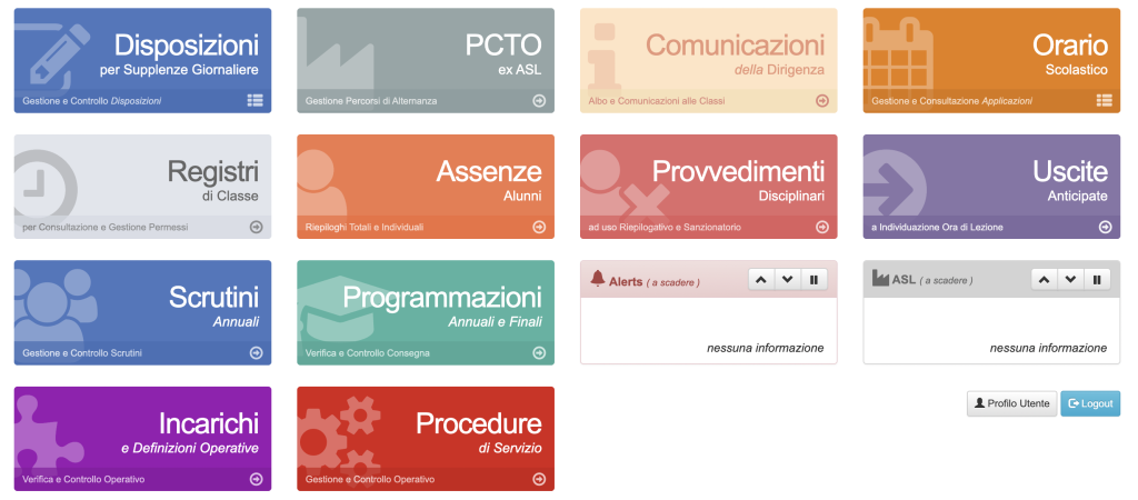 ProfiloDATA BASE ADMINISTRATOR ProfiloDIRIGENTE SCOLASTICOProfiloCOLLABORATOREProfiloDOCENTEProfiloINSEGNANTE TECNICO PRATICOProfiloDOCENTE DI SOSTEGNOProfiloGENITORE E/O AFFIDATARIOProfiloALUNNOProfiloPERSONALE ATAProfiloPERSONALE UFFICIO DIDATTICAProfilo Tutor per iPERCORSI PER LE COMPETENZE TRASVERSALI E L’ORIENTAMENTOProfiloREFERENTE USCITE ANTICIPATE